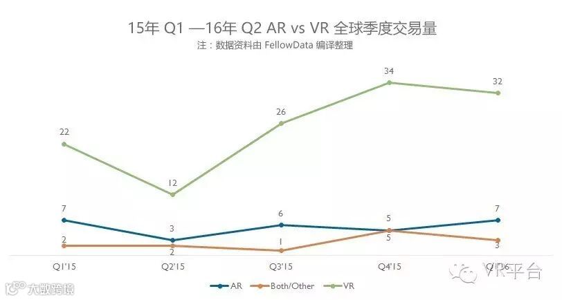 2016 年第一季度,VR 行业的投融资总数从34 笔减少至 32 笔,同比下降了 6%。