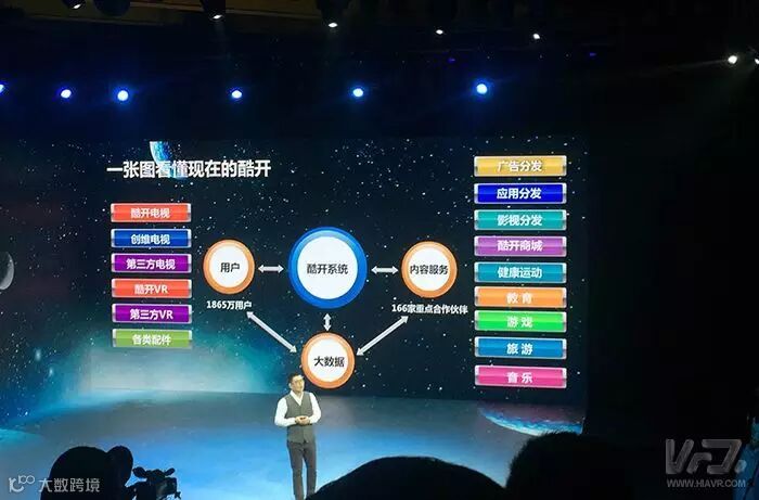 在发布会一开始,首先为大家介绍了酷开品牌的发展历程,并且以一张简洁明了的图片介绍了现在的酷开,从中可以看出VR在酷开产品线中还是极为重要的。