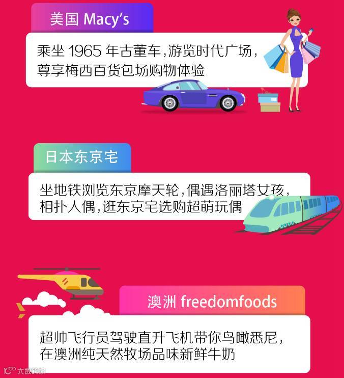 除了购物,Buy+还将给消费者带来特别的VR旅行和生活方式体验,“乘”地铁浏览东京台场彩虹桥、摩天轮,偶遇二次元美少女;或者跟随超帅飞行员“驾驶”直升飞机鸟瞰悉尼,在澳洲牧场享受丰盛早餐,品味新鲜品质牛奶享用香甜燕麦片;热情的黑人司机驾1965年古董车,带你游览纽约时代广场…
