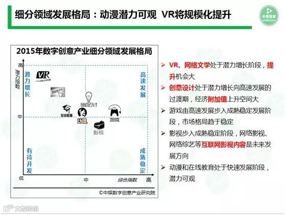 细分领域发展格局方面,VR、网络文学处于潜力增长阶段,提升机会大;创意设计正在向高速发展过渡,经济附加值空间大;游戏相对成熟稳定;网络影视、网络综艺等互联网影视内容是未来发展方向;动漫和在线教育处于快速发展阶段,潜力可观。