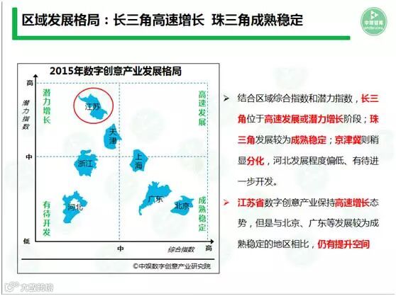 与此同时,区域发展呈现差异分布格局:长三角处于高速增长阶段,珠三角成熟稳定,京津冀则稍显分化,河北发展程度偏低。江苏省数字创意产业保持高速增长态势,与北京、广东等发展较为成熟稳定的地区相比,仍有提升空间。
