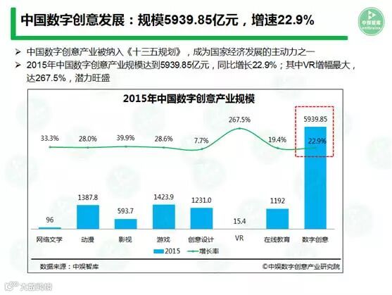 2015年我国数字创意产业规模达到5939亿元,同比增长22.9%,其中VR增幅最大,达267.5%。七大细分领域中,网络文学是IP源头,增速快;动漫的衍生市场潜力大;影视受众广泛,爆发强劲;游戏规模1424亿。而电竞、VR是新增长点,VR规模15.4亿,处于起步阶段,潜力旺盛;在线教育结合语音识别、AI等技术将有更多应用。
