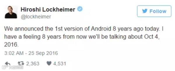 谷歌高管Hiroshi在Twitter上发推表示:“8年前我们发布了安卓系统的首个版本,我相信8年后我们将谈论起2016年10月4日的盛会”暗示即将到来的发布会将是自安卓系统发布以来最重要的一次发布会。