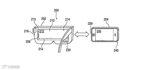 专利描述称,这款设备是“一款能够放入手机的物理框架,并将手机屏幕放置于用户眼前,其中在用户双眼和手机屏幕之间存在着光学组件,用于接收手机屏的图像”。看上去和三星的Gear VR颇为相似,只是这款专利设备还拥有内置的耳机、苹果的Lightning接口以及定制镜头。