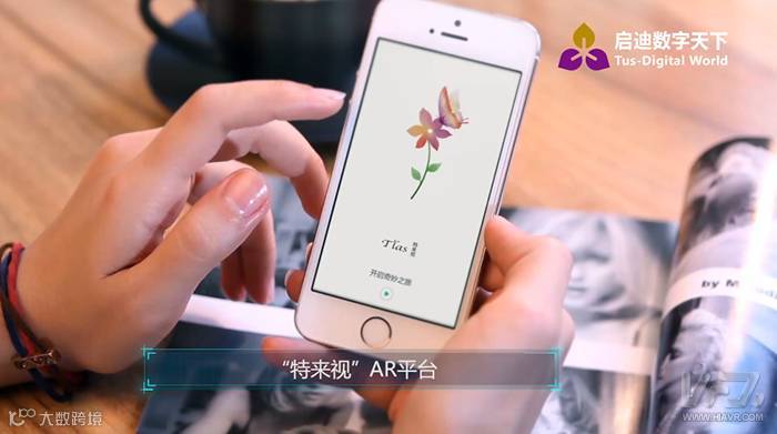 工作人员首先介绍了"特来视",根据介绍,这是基于AR技术的一款应用,由启迪数字天下研发,通过对图像、实物进行云识别并实时将虚拟数字信息叠加在现实场景中,用三维全景、CG动画、三维模型、影音视频等交互方式改变使用者的认知。