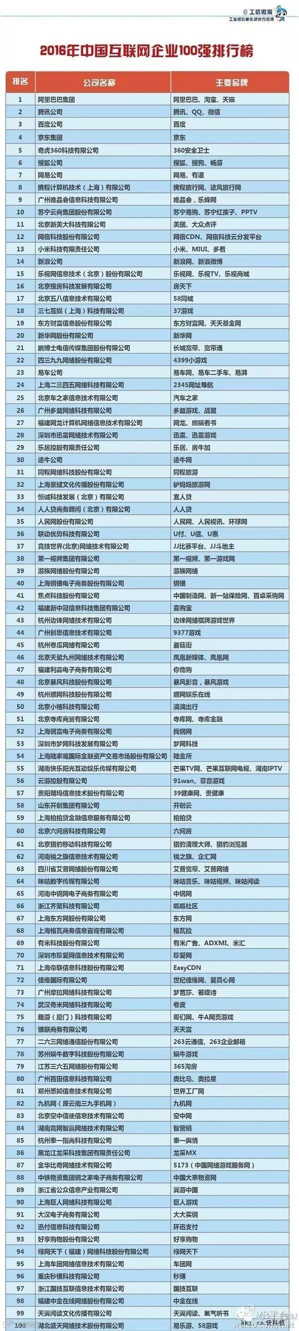 近日,工信部公布了2016中国互联网百强企业名单,毋庸置疑,BAT三巨头仍然占据着前三名的位置,阿里巴巴也还是稳稳地坐着头把交椅。