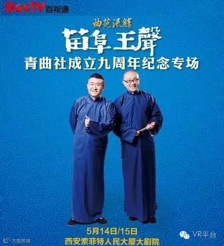你可能会用VR玩游戏、看电影,但是你看过VR版的相声吗?5月14、15日,著名相声演员苗阜、王声即将率领青曲社在西安与粉丝共度“青丝节”,并通过BesTV百视通手机 APP进行VR直播,这也将成为国内首场VR相声剧直播。
