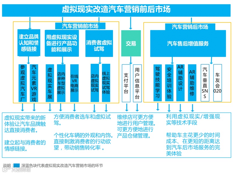 而虚拟现实技术将会对汽车营销的前后市场进行改造,提升汽车厂商运营效率和同时,为车主提供更便捷、直观的用户体验,进而提升交易效率。