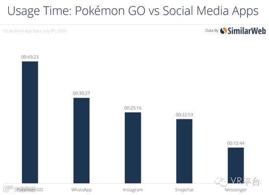 从柱状图直观的看来,Pokémon GO占据了用户大量的时间。截至7月8日,该应用日均被使用43分钟23秒,高于WhatsApp、Instagram、Snapchat、Messenger等广为流行的移动通讯应用。