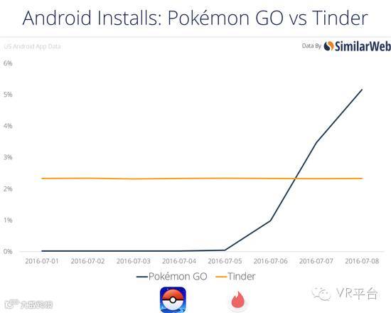 7月8日,上线仅两天,Pokémon GO便已经安装于美国5.16%的Android设备上。截至7月7日周四,Pokémon GO在美国Android手机上的安装量已经超过Tinder。