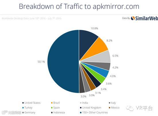此外,APKMirror的流量来自全球各地,过去28天里美国仅占该网站桌面流量的10.8%。巴西的用户也热衷于通过APK下载Pokémon GO,在APKMirror桌面流量中的占比达8.2%,仅次于美国。