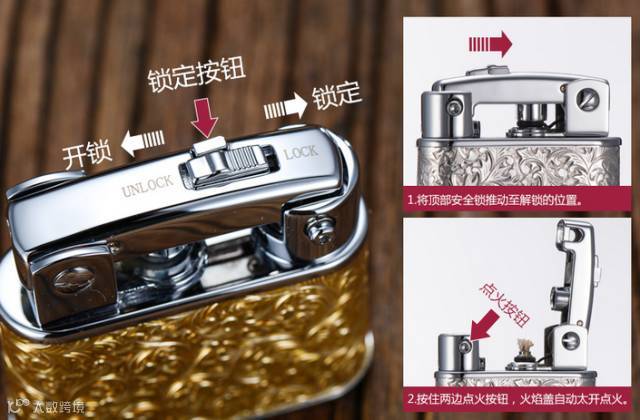 1、点火前:请先解开安全锁,即往(UNLOCK) 方向推动解锁开关解锁,再同时按压两侧点火按钮即可着火。点完火后关闭火焰盖,再按下闭锁按钮即可。