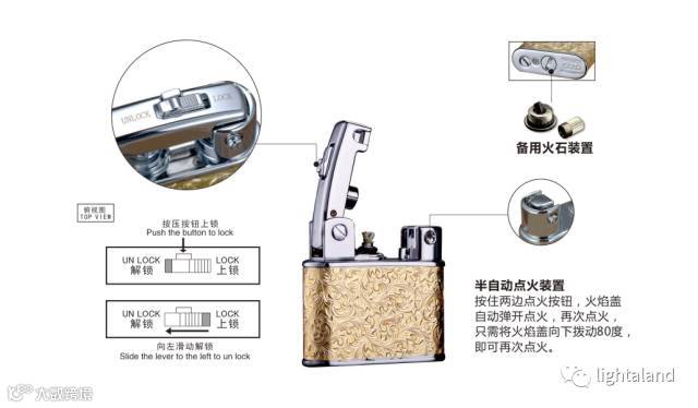2、自动点火方式:按压点火按钮自动弹开着火;在没有完全关闭火焰盖的状态下,再次按压轻放火焰盖80度左右即可实现再次点火。