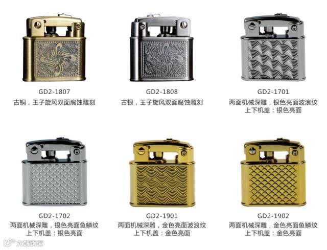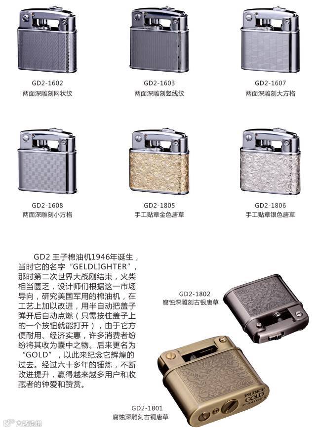 PRINCE(王子)GD2棉油机1946年诞生,当时它的名字“GELD LIGHTER”,那时第二次世界大战刚结束,火柴相当匮乏,设计师们根据这一市场导向,研究美国军用的棉油机,在工艺上加以改进,用半自动把盖子弹开后自动点燃(只需按住盖子上的一个按钮就能打开),由于它方便耐用、经济实惠,许多消费者纷纷将其收为囊中之物。后来更名为“GOLD”,以此来纪念它辉煌的过去。经过六十多年的锤炼,不断改进提升,赢得越来越多用户和收藏者的钟爱和赞赏。