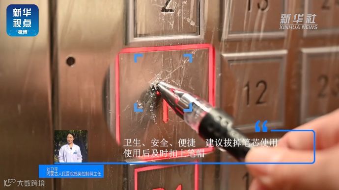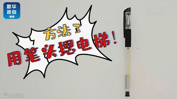 【不直接触碰按键,利用笔头摁电梯按键】