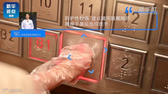 【不直接触碰按键,戴上一次性手套摁电梯按键】