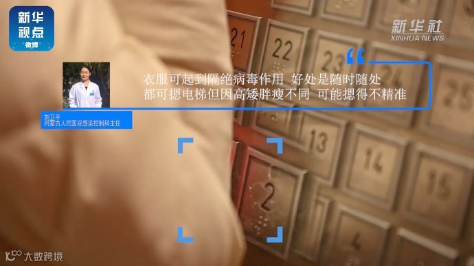 衣服起隔离病毒的作用。好处是随时都可以摁电梯,但由于高矮胖瘦不同,可能会造成摁不精准情况。