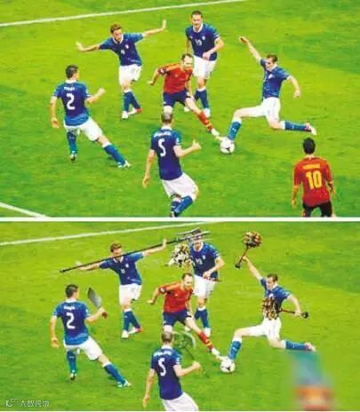 「西班牙以脚法细腻著称,经常可以看到一名球员被对手包围拦抢的镜头。其中这次伊涅斯塔遭遇意大利五人围抢镜头因为搞笑的防守动作,流传于世界。」