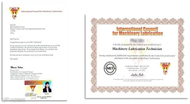 学员通过考试成绩合格,将获得国际机器润滑工程师(MLT I、MLT II)、机器润滑剂分析师(MLA I 、MLA II)证书,该证书可在国际机器润滑协会网站(www.lubecouncil.org)查询。认证均符合国际ISO18436-4/5要求。