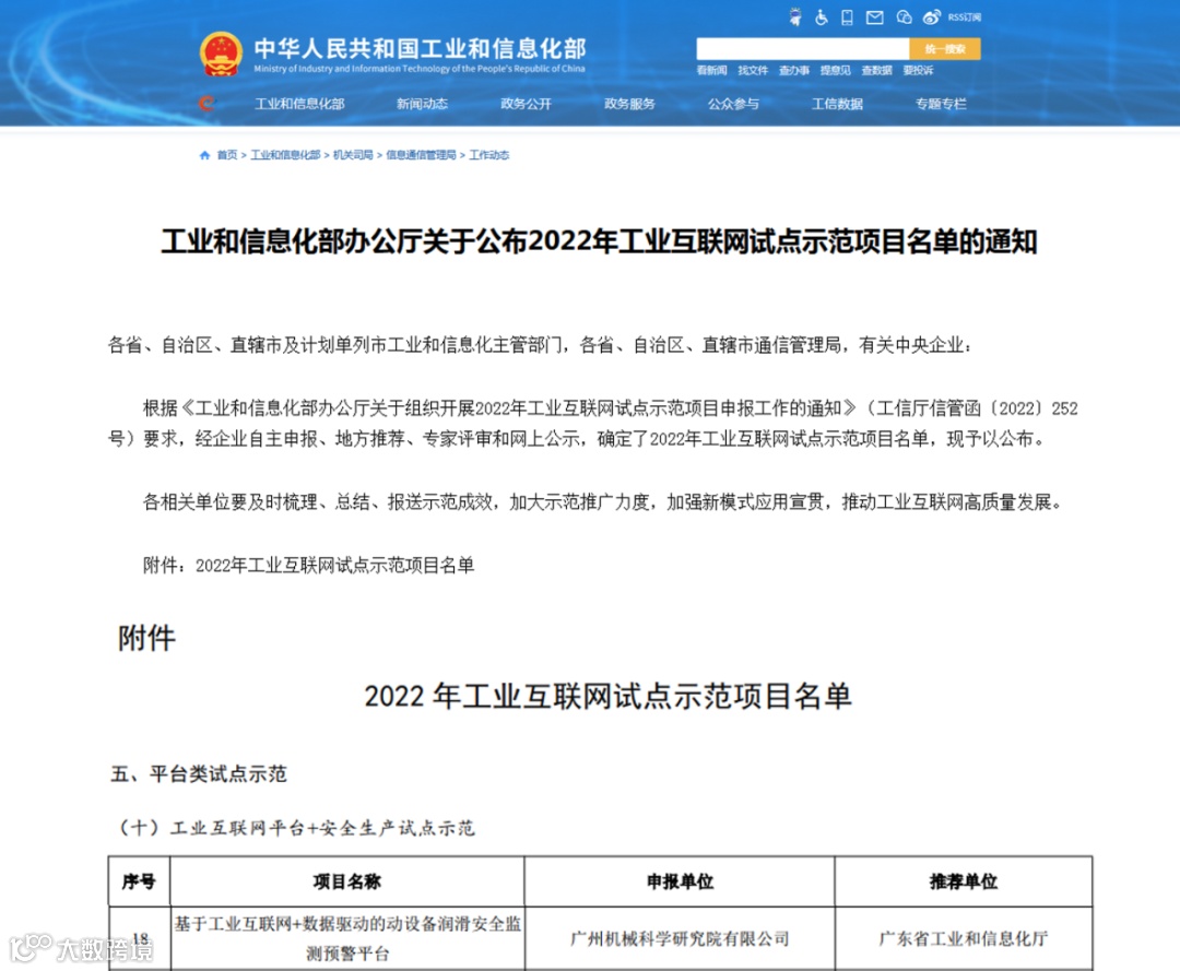 近日,国家工业和信息化部公布了“2022年工业互联网试点示范名单”,我司 “基于工业互联网+数据驱动的动设备润滑安全监测预警平台” 项目成功入选工业互联网平台+安全生产试点示范。