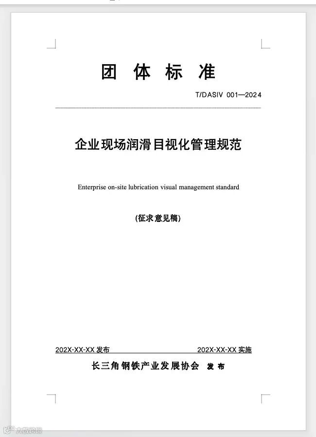 《企业现场润滑目视化管理规范》团标进入初审阶段。在冶金钢铁行业,该标准适用于钢铁炼焦、炼铁、炼钢、轧钢及动力等现场润滑管理中的油品仓储管理和加换油管理。针对现场不同润滑油脂目视化标识标准化,通过合理应用目视化管理中的标识法、图形法、颜色法赋予每种润滑油脂不同的符号;仓库不同润滑油脂放置区域的目视化区分,合理应用目视化管理中的定位法、标识法、分区法、图形法、颜色法确定仓库润滑油脂的标准化摆放;仓库润滑油二级储存桶、抽油泵、加油壶、加脂枪等工器具的目视化规范,做到工器具与润滑油脂的一一对应;设备润滑点的目视化规范,确保不同润滑油脂、二级储存桶、加油壶、加脂枪目视化标识的一致。