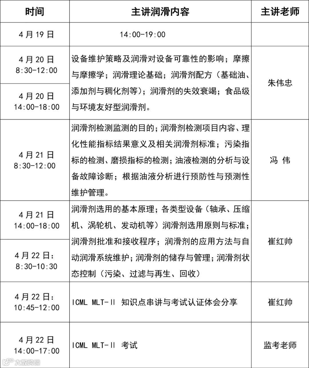 本次培训由广研检测联合国际机器润滑理事会(ICML)、机械工业润滑工程技术研究中心、工业摩擦润滑技术国家地方联合工程研究中心、美国 NORIA 润滑管理咨询公司、广州机械科学研究院有限公司定于2022年4月20-22日在北京举办。