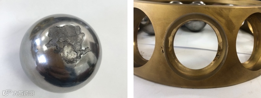 为了避免故障演化后对油浆泵造成下一步的恶劣损伤,影响到炼油装置的安全运行;现场对该油浆泵进行了解体检修,拆检后发现了轴承箱底部有金属磨屑粉末,其中角接触轴承的一颗滚动体表面磨损剥落,保持架的相应部位出现损伤。