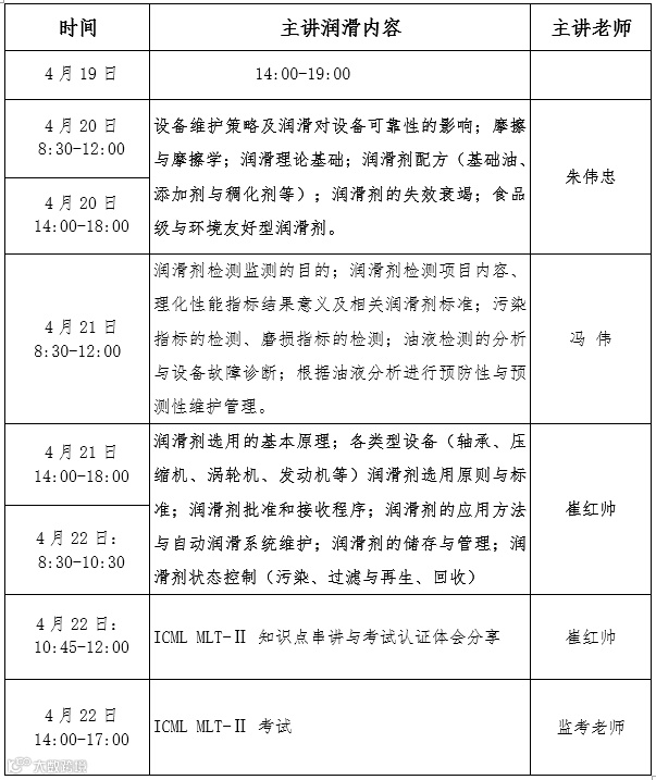 本次培训由广研检测联合国际机器润滑理事会(ICML)、机械工业润滑工程技术研究中心、工业摩擦润滑技术国家地方联合工程研究中心、美国 NORIA 润滑管理咨询公司、广州机械科学研究院有限公司定于2022年4月20-22日在北京举办。