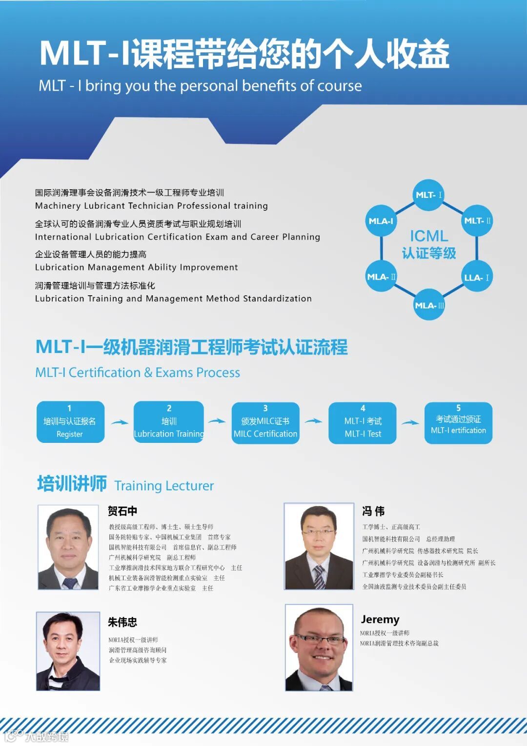 MLT-Ⅰ一级机器润滑工程师是国际机器润滑理事会(ICML)资质认证的一环,获得国际机器润滑理事会认证等于承认了您在应用机器润滑知识解决及保证润滑设备可靠性方面的专长。同时也表明工业界对您在机器润滑技术所具备的知识和技能的认可。