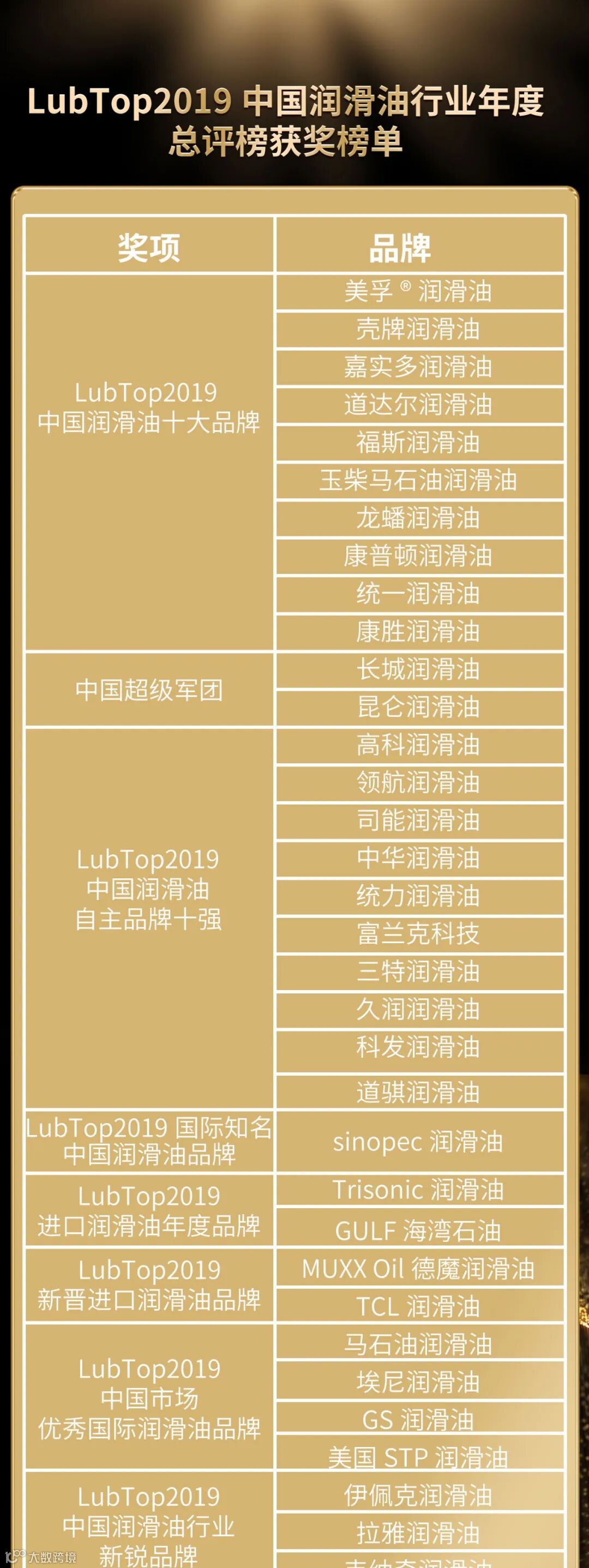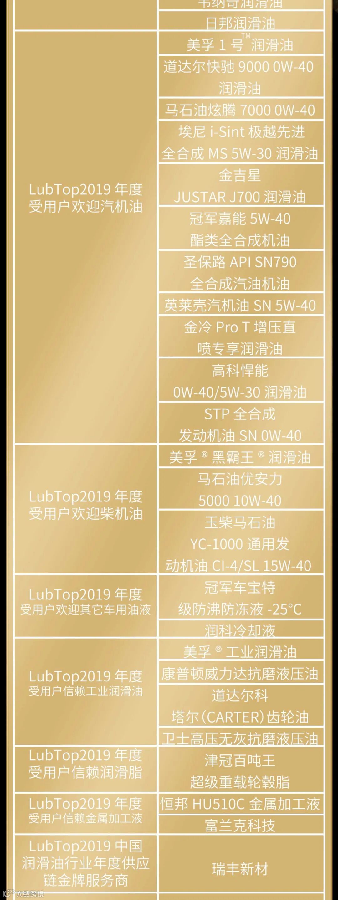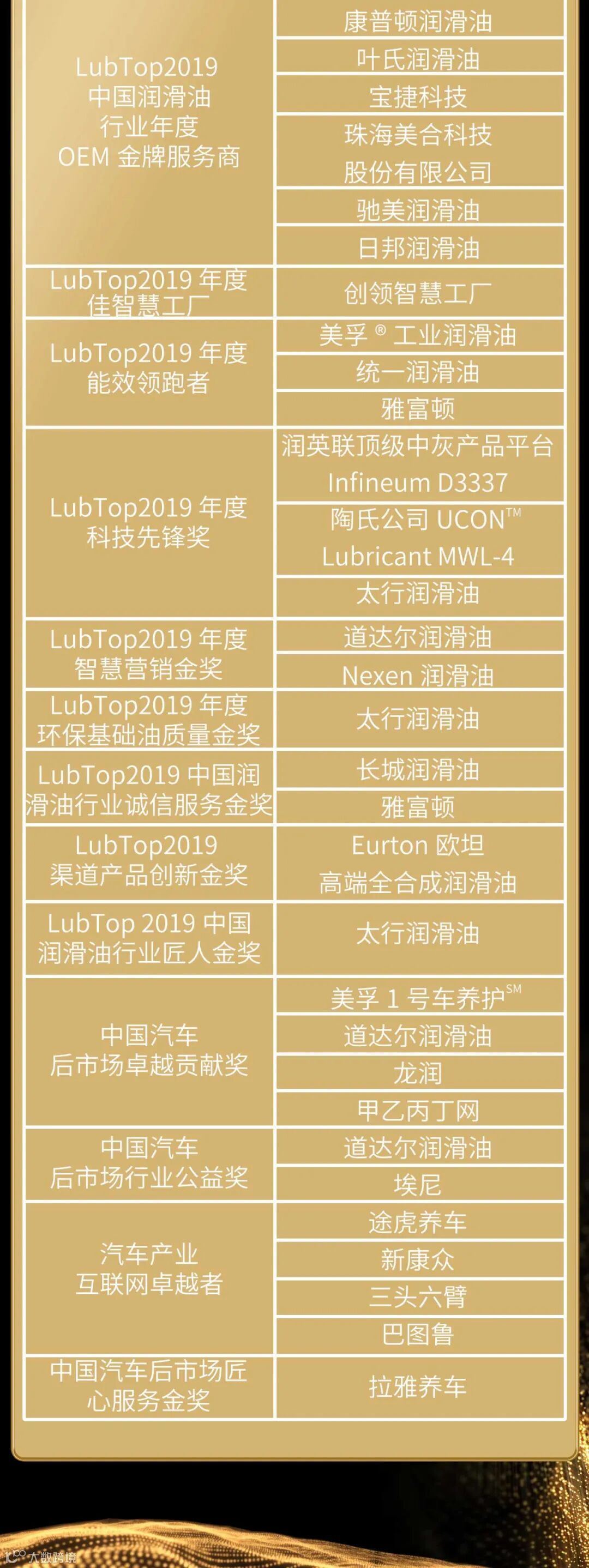 作为服务3亿车主用户、连接万亿汽车后市场规模、解决全球第一制造大国设备润滑需求的中国润滑油产业,每年一度的“LubTop总评榜”备受业内瞩目。“LubTop总评榜”以技术创新、市场表现、用户满意度、行业影响力四大维度为品牌评价体系,持续创新活动模式,发现好产品,彰显好品牌。经过公众消费者网络投票、专业市场调研、专家导师团严格评审流程,评选出润滑油和汽车后市场行业年度优秀获奖品牌。