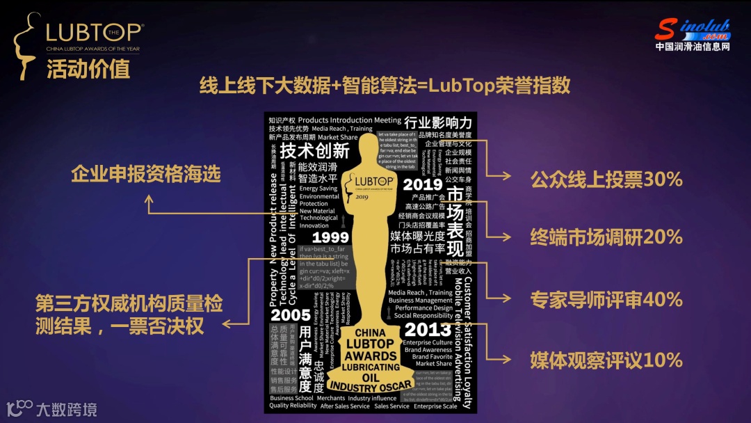 作为汽车后市场和设备管理领域的标杆性活动之一,“LubTop总评榜”以专家导师团的全球视野和专业精神,对评选高标准原则的坚持和底线思维的坚守,全媒体平台和合作资源对终端的渗透力,赢得国际一线品牌和中国知名自主品牌对LubTop的支持和厚爱,形成渠道和终端消费者对LubTop品牌的信赖和良好口碑,打造了LubTop总评榜“公信力强、影响力大、互动性好、美誉度高、渗透力深、传播力广”的6A品牌内核。LubTop2019以“智创能效 赢领变革”为主题,聚焦行业发展新的热点与趋势,以绿色发展托举起产业升级的重任,以节能环保、提质增效理念为核心的“综合能效”润滑引领行业技术、产品、商业模式的创新与变革。
