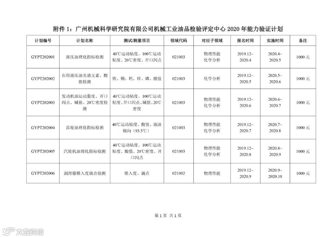 附件1:《机械工业油品检验评定中心2020年能力验证计划》