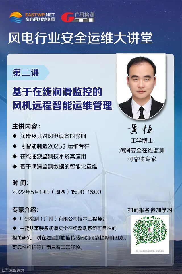 5月19日(周四)下午15点-16点,由东方风力发电网与广研检测共同打造的风电行业安全运维大讲堂第二期直播《风电润滑管理理念与可靠性维护策略》开讲了!