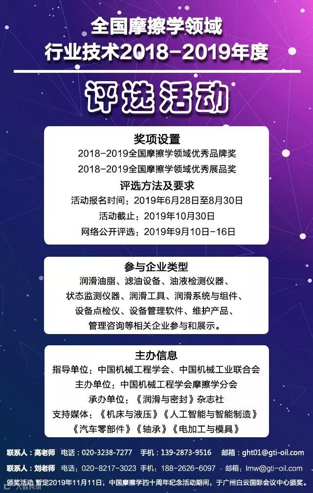 全国摩擦学领域2018年度评选活动公开向业界征集报名,符合报名范围的先进制造与摩擦学行业企业均可报名。评选聚焦全国摩擦学领域,从产学研合作、技术创新、优秀案例、市场竞争力、年度大事件、市场口碑、规模实力等多维度进行综合考核。