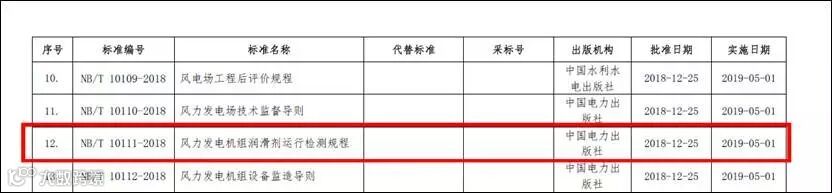 近日,从国家能源局网站上获悉,由我司主编的《风力发电机组润滑剂运行检测规程NB/T 10111-2018》能源行业风电标准,已通过国家能源局审批,由中国电力出版社正式发布。