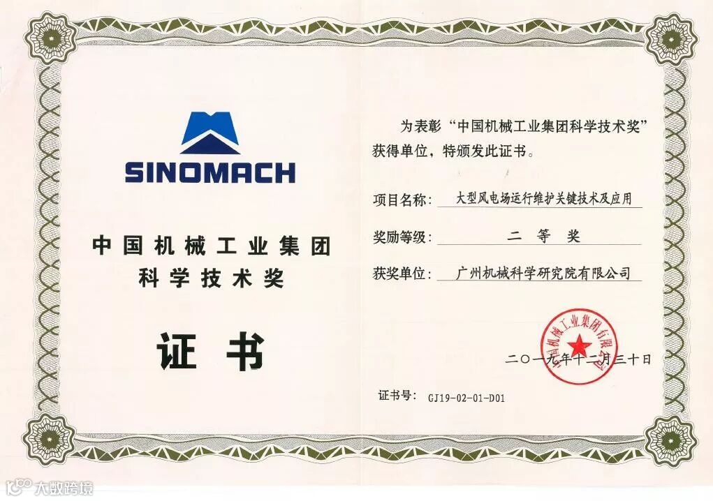 我司《大型风电场运行维护关键技术及应用》荣获2019年度“中国机械工业集团科学技术奖”二等奖