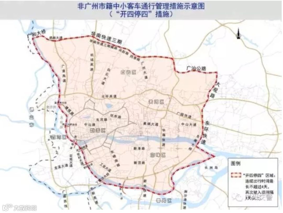所谓开四停四,就是非广州市籍中小客车驶入广州市中心区连续行驶时间最长不得超过4天(自然日),再次驶入须间隔4天(自然日)以上。实施这一管控措施的区域面积,占广州全市区域面积的3.5%,包括了越秀区、天河区的全部,和荔湾区、白云区大部分。