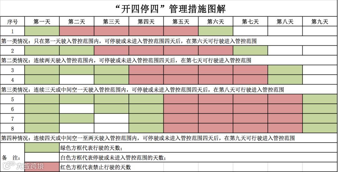 这些地方大多都是按照“特定时间的特定区域实施禁行”的思路,相较之下,广州的办法有些与众不同。“开四停四”,听起来有点复杂,具体怎么实施呢?广州交警给出了一张图示: