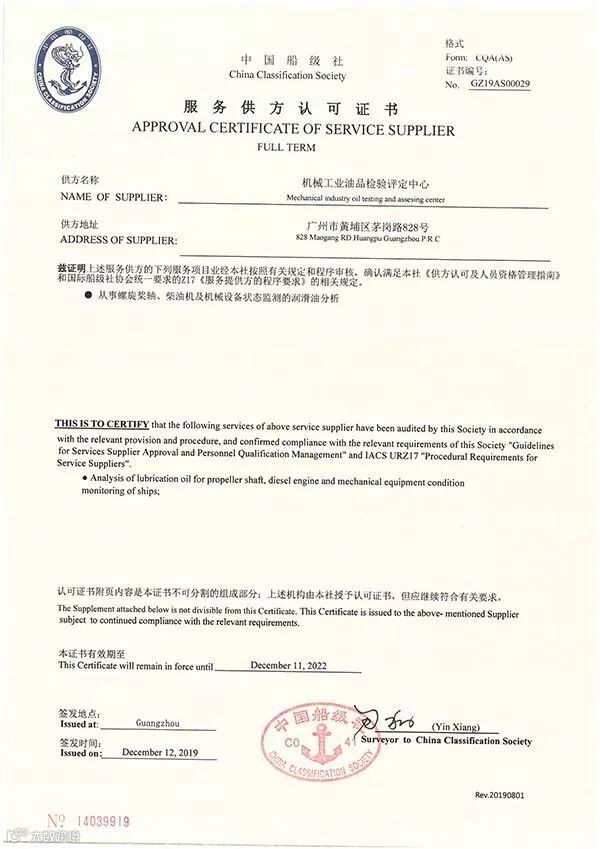 2019年12月12日,广研检测通过中国船级社(CCS)服务供方认可,自此本中心将为船舶舰艇提供油监测服务。这是继2017获得民用航空油料检测单位后,获得的又一个重要资质,我中心油品监测服务实现“海、陆、空”的领域布局。