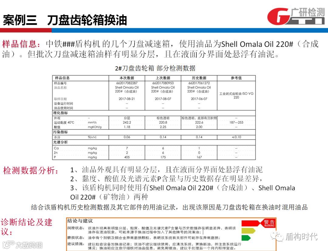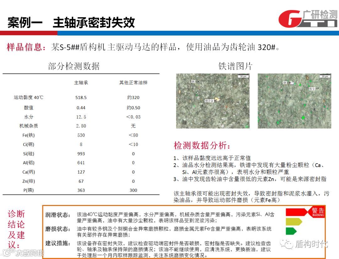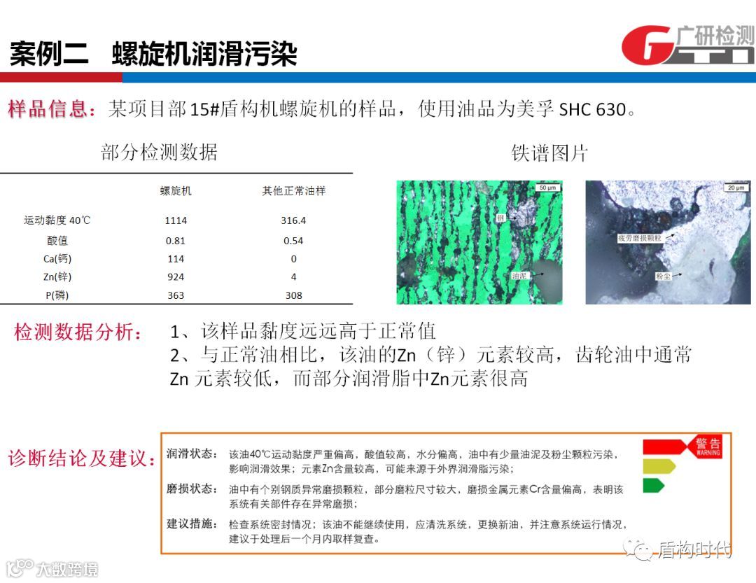 具体承担“油液监测”项目的部门是本院所属的广州机械科学研究院设备润滑与检测研究所,拥有“机械工业油品检验评定中心”和“广州机械科学研究院设备润滑与磨损状态监测中心”,该所是国内最早从事油品检验评定、设备润滑磨损状态监测及故障诊断技术研究和应用的机构之一,同时也是全国性的油品检验评定机构。该所拥有功能齐全的实验室和国际先进水平的分析检测仪器,其监测技术队伍中,配备有多种专业的技术人员,如机械、化学、计算机等,既有长期从事工业油品分析评定、设备润滑磨损工况监测的高级工程师,又有一批操作熟练、分析准确的专业分析人员。该所多年来与德国、英国、澳大利亚、芬兰等国家及国内著名大学在摩擦学领域进行过长期的技术交流和合作,在国内摩擦学研究及设备润滑故障诊断方面有较高的行业地位。特别是近十余年来,该所凭借雄厚的技术力量和先进的检测手段,以市场化的商业实验室运作机制,积极向企业推广应用油液检测的诊断技术,为沿海地区电力、石化、海洋石油、交通、铁路、港口、船舶、矿山,制造等行业的数百家企业以及众多国际著名润滑油公司提供油品分析和设备润滑磨损状态监测技术服务,同时为中国中铁、中国铁建、中交建设等施工建设单位提供油液监测服务,也为海瑞克、铁建重工、中船重工等盾构生产商提供了润滑油检测技术服务,成为目前国内权威性的专业化油品检测实验室。