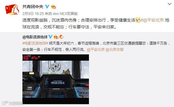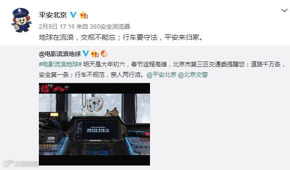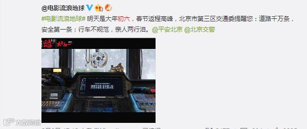 《流浪地球》官方微博借用这句台词,提醒初六返程的人们注意安全,还艾特了@平安北京和@北京交警。