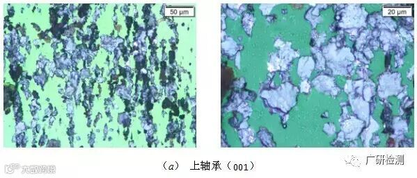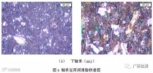 对循环水泵上轴承(001)、下轴承(002)的在用润滑脂样品进行光谱元素分析和铁谱分析,样品的光谱元素分析结果见表1,铁谱分析图片分别见图6。