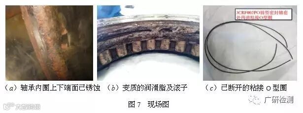 检查水泵轴承内圈上下端面已严重锈蚀并可见表面剥落,如图7(a);内圈外表面已严重磨损,磨损沟槽明显磨痕均匀,其磨损深度约0.2mm;滚子表面已严重磨损,磨痕均匀,如图7(b)。而进水的原因是轴套下部两道O圈为粘接形式,非整圈O圈备件,此O圈拆卸时接口已经断开,密封失效, 如图7(c);海水通过O圈进入轴套内,从而进入下部轴承室中,海水加速润滑脂氧化、破坏润滑脂皂基结构,使得基础油流失,润滑脂变质,出现润滑不良。