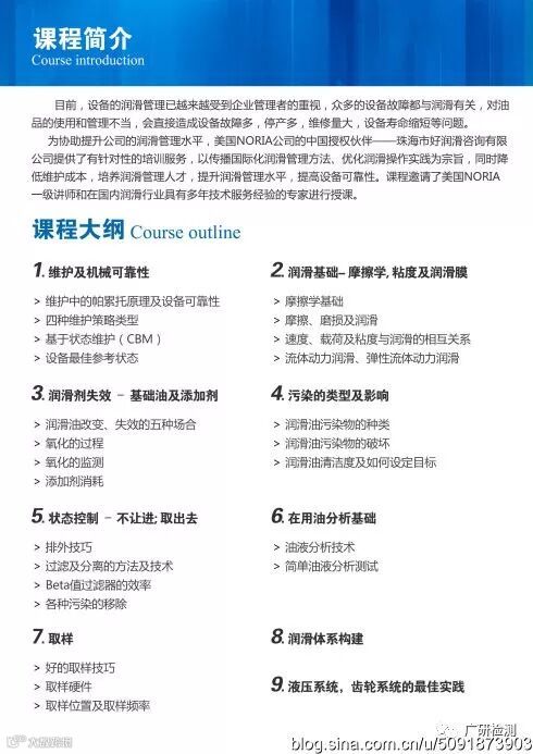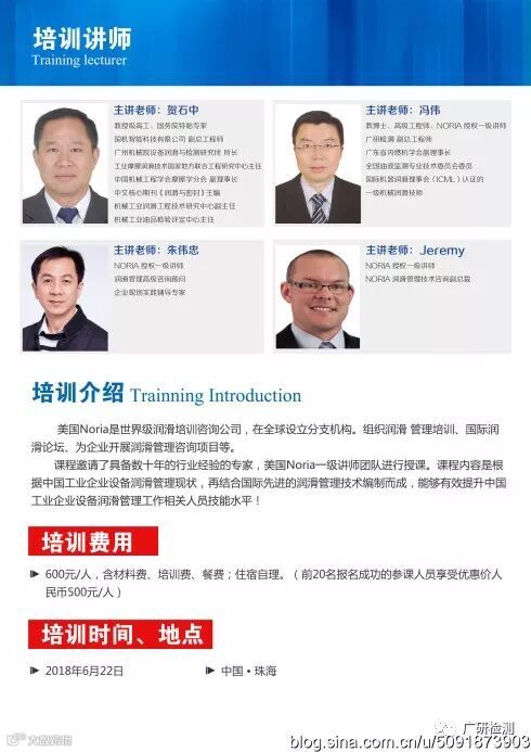 为协助提升公司的润滑管理水平,美国NORIA公司的中国授权伙伴——珠海市好润滑咨询有限公司提供了有针对性的培训服务,以传播国际化润滑管理方法、优化润滑操作实践为宗旨,同时降低维护成本,培养润滑管理人才,提升润滑管理水平,提高设备可靠性。课程邀请了美国NORIA一级讲师和在国内润滑行业具有多年技术服务经验的专家进行授课。