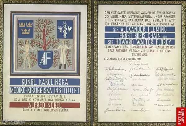青霉素的发现者亚历山大·弗莱明、柴恩和佛罗里的证书,治病救人的医学的标志在右上角,一边是医生、一边是士兵——二战的时候,青霉素让不少人得以从感染中脱身。