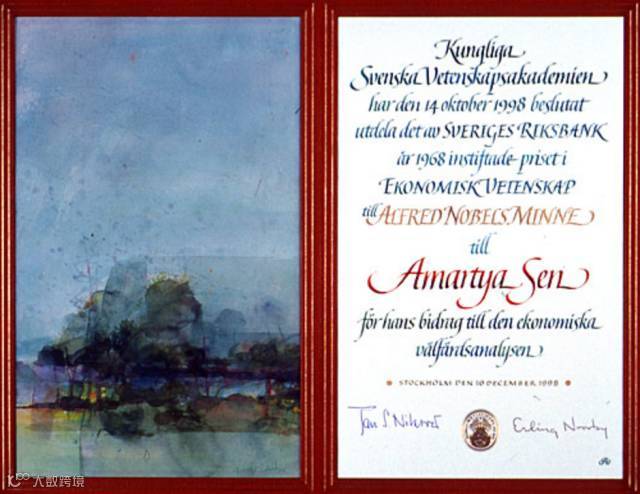 经济学家、1998年获奖的阿玛蒂亚·森的证书,算是最抽象的一个。