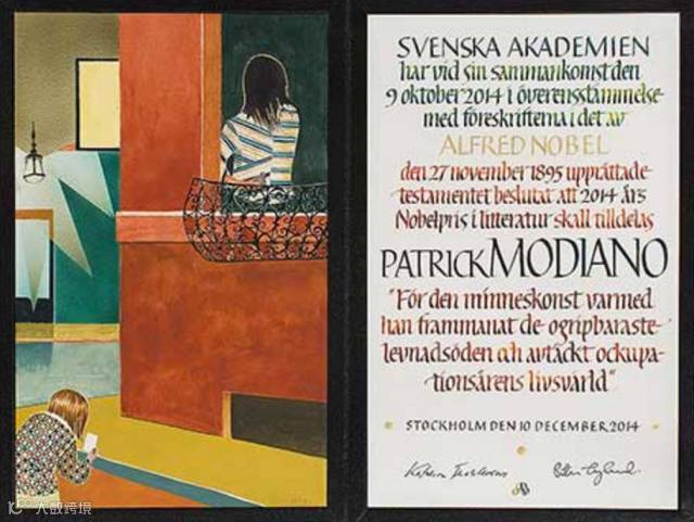 ▲ The Nobel Prize in Literature 2014-Patrick Modiano/Artist: Jens Fänge/Calligrapher: Annika Rücker