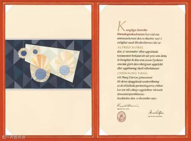 第一个华人诺贝尔奖获得者杨振宁的证书。他于1957年因“宇称不守恒”理论的贡献获得诺贝尔物理学奖,跟粒子的衰变有关。带有抽象画风格的粒子、镜面的“守恒”构成了主要元素。