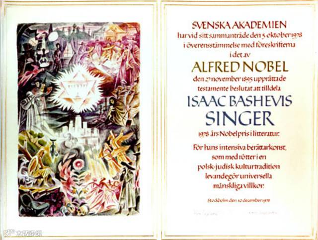 犹太作家辛格的证书。版画风格的设计,融合了许多元素,艺术家Birger Christofferson是这样解释的:中间是犹太人的大卫之星,旁边分别有The Magician of Lublin、拉比拿着犹太人的Torah Roll、The Slave里的Jacob、Satan in Goray、弥赛亚,最右边还有纳粹。中间是纽约。