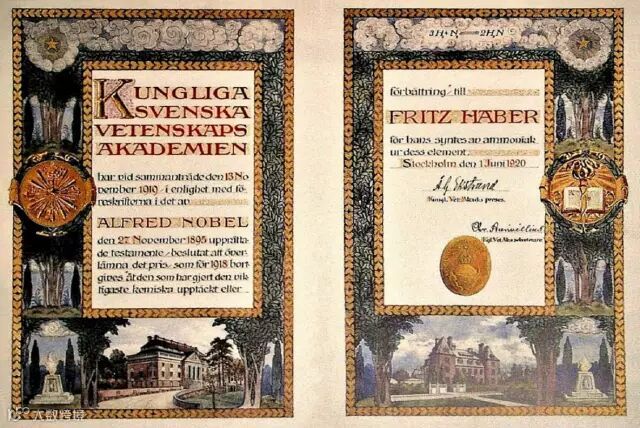 这是1918年的诺贝尔奖化学奖得主弗里茨·哈伯(Fritz Haber)(上面写的1919年是他实际拿到奖的时候),他的哈伯-博施法(Haber-Bosch process)制氨气的公式还写在上面,来我们一起来复习高中化学……那么顶上飘的那一坨,就是氨气了,茂密的植物也昭示了他的发明对人类应该有的贡献。